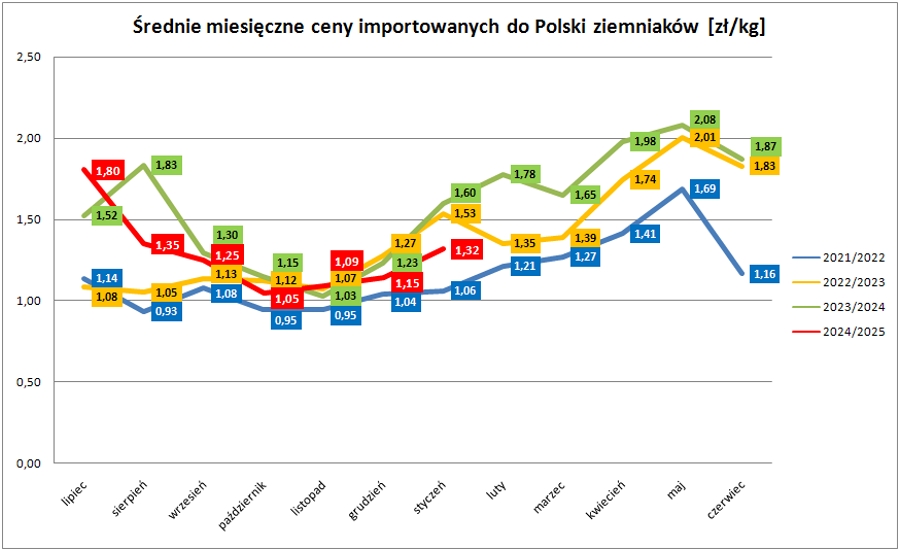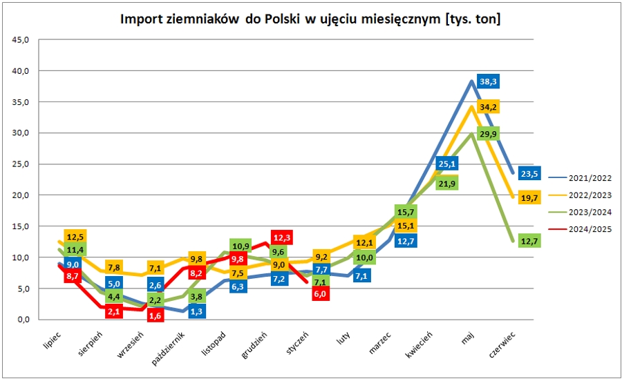 On the contrary, the situation was different with potato imports to Poland. Despite a significant increase in the average price (+4 percent in January compared to a 16 percent decrease in December), we saw a clear decrease in the volume of potatoes imported to our country. In January, there was a whopping 51 percent less compared to December and 16 percent less compared to January 2024.
